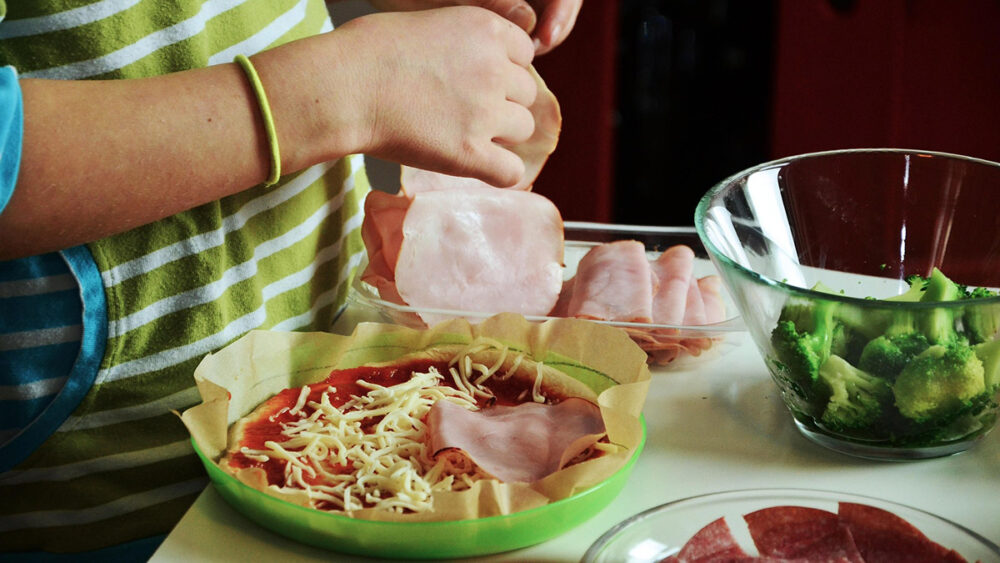 Här finns inga regler. Skinka, salami eller champinjoner på burk är klassiker. Vill du göra det ännu enklare – kör bara ost och lite oregano för en snabb ”fusk-Margherita”.