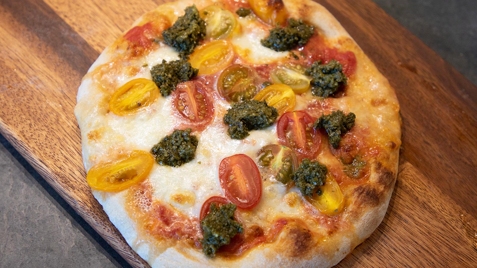 Detta är en pizza som försöker ta den enkla grunden från Margheritan och sedan bygga på den med ett par ingredienser till. I detta fall har vi även lagt på lite småtomater och pesto. Alltså enkelt och smidigt sätt att tillföra lite mer smak till pizzan