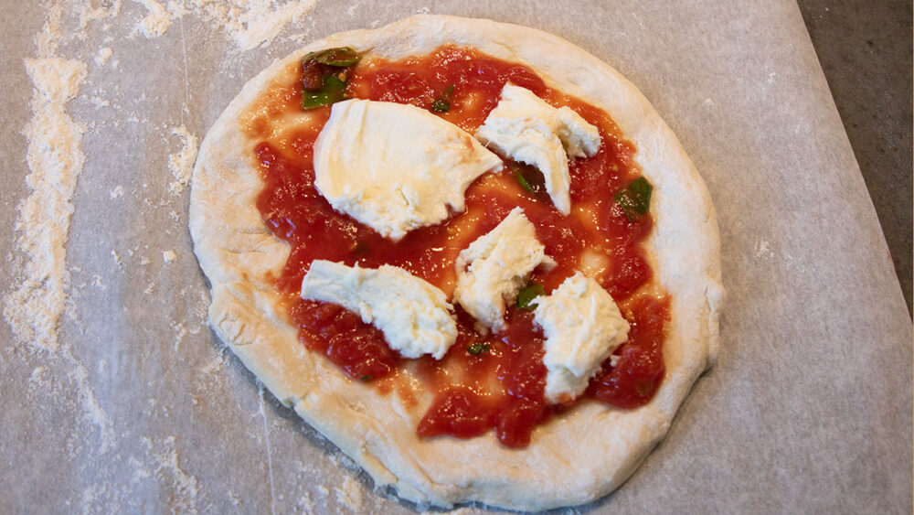 - Ta ut pizzan och strö över lite färska blad med basilika och olivolja.