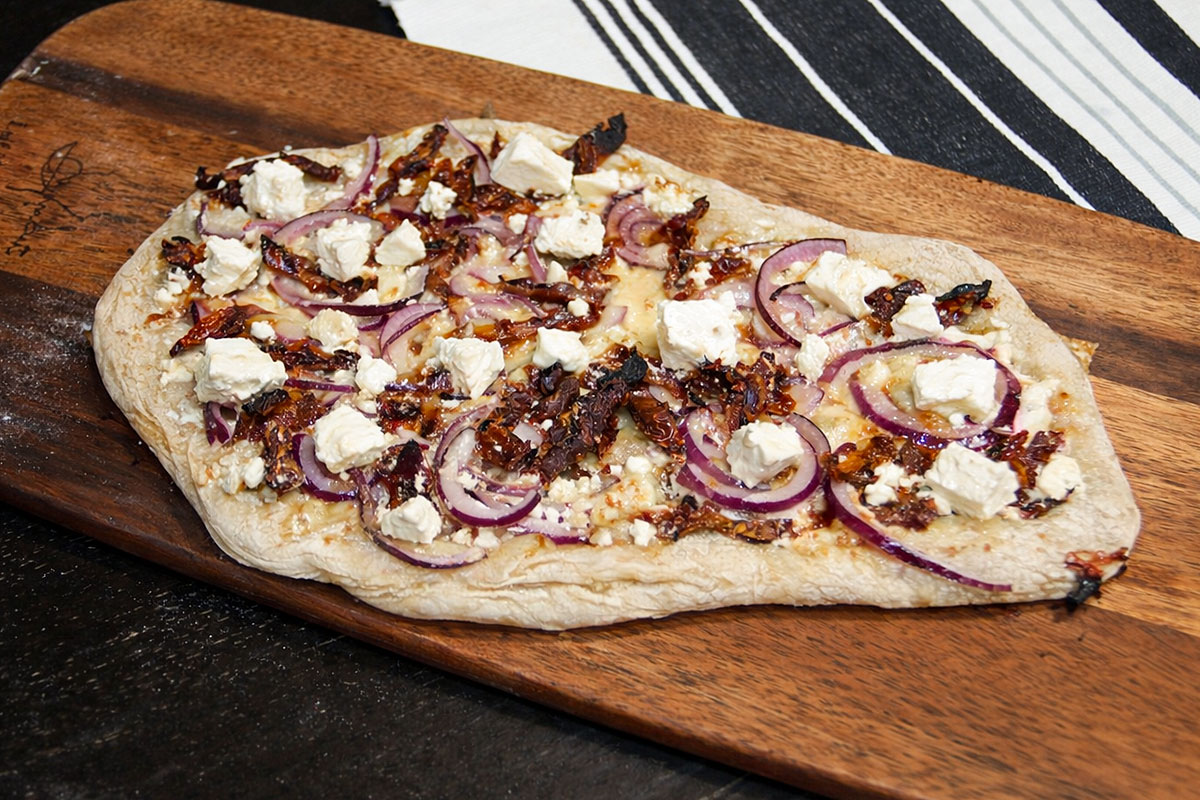 Den här pizza bianca med crème fraiche, soltorkade tomater, fetaost och rödlök är ett bra exempel på hur pizza kan fungera utmärkt i andra sammanhang än som huvudrätt. Utan tomatsås och med en mild, krämig bas blir pizzan lättare i uttrycket, samtidigt som smakerna är tydliga och balanserade.