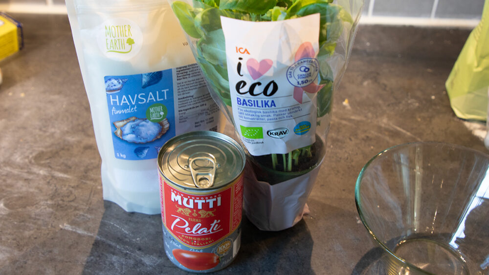 - Krossa tomaterna i en skål med händerna. Kan använda hjälpmedel till detta men blir resultat med händerna.